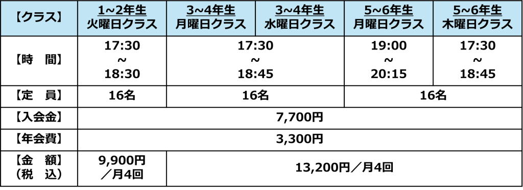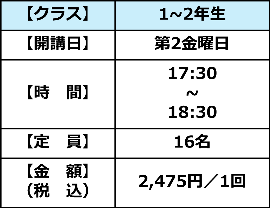 ※体験・振替・追加は1~2年生のみ1dayコースで受け付けます。