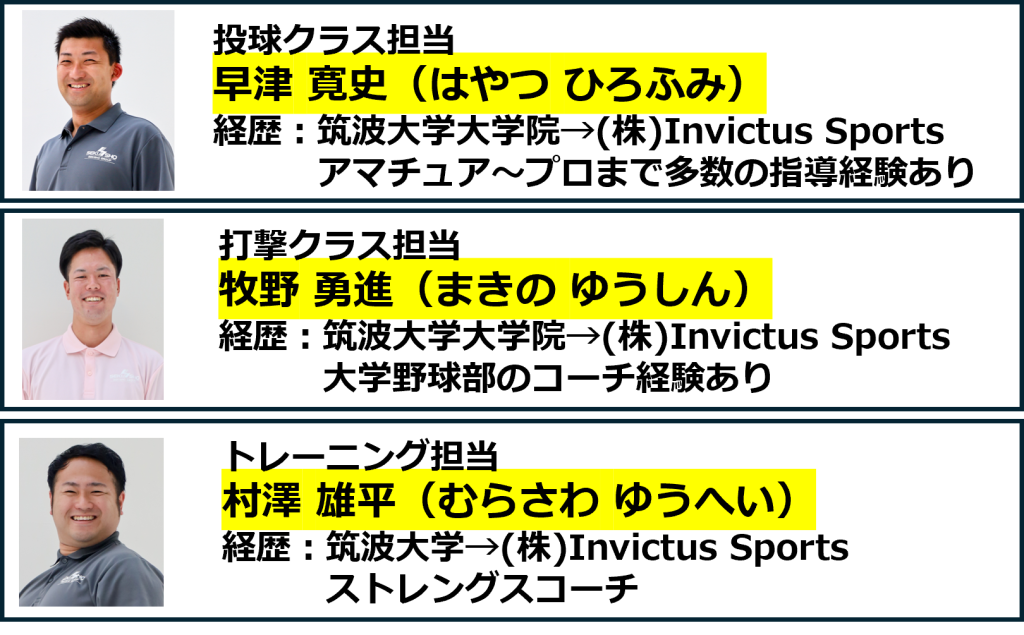 専門的で質の高い指導を実現するために野球専門コーチと資格を保有したトレーナーが各クラスを担当します。