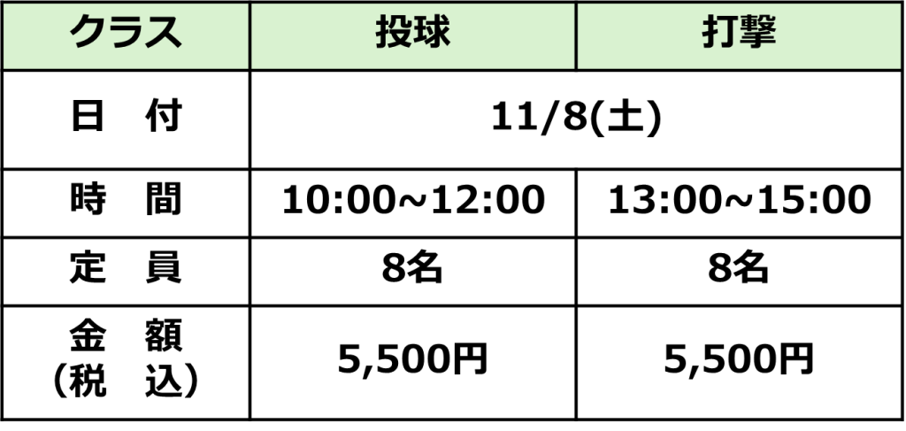 (投球クラスはグローブのみ、打撃クラスはグローブとバット、両方を持参ください。)