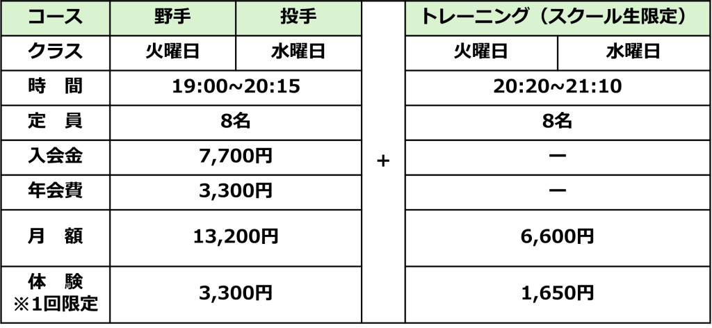 野手・投手コースのみの受講ももちろん可能ですが、パフォーマンス向上のためトレーニングコースの受講も是非ご検討ください。