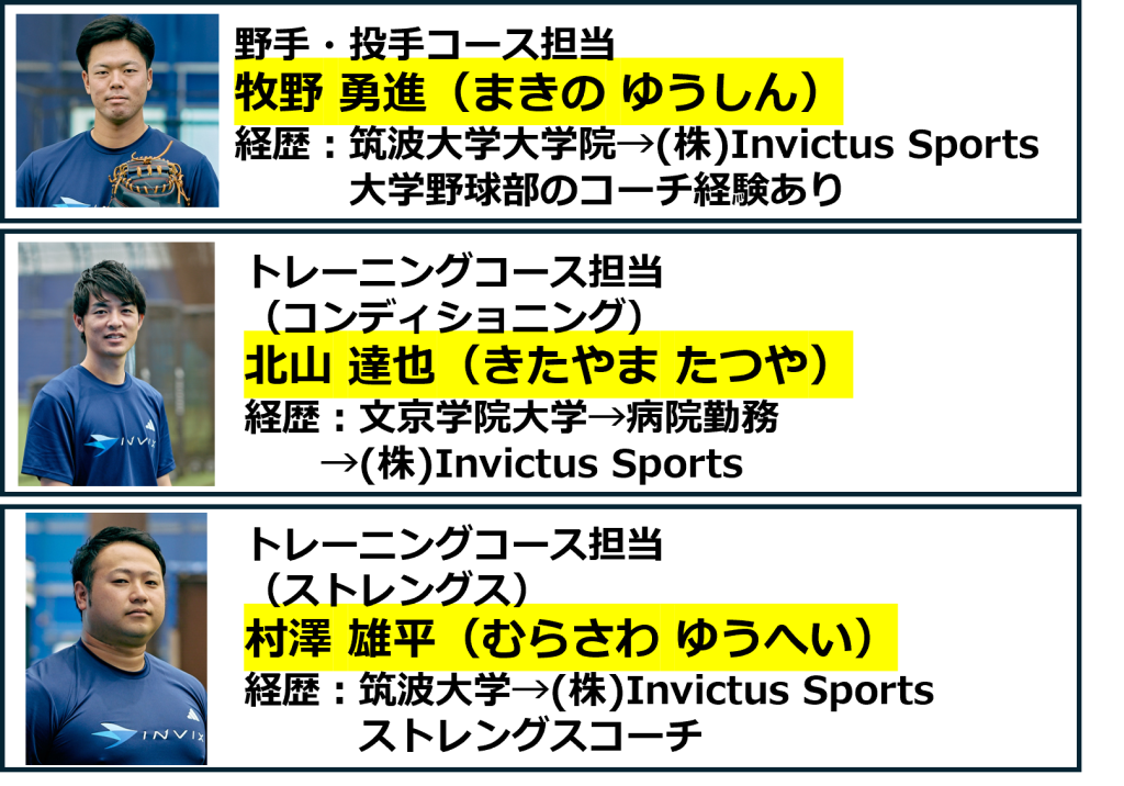中学生スクールでは、野手コースと投手コース、トレーニングの3コースを開講し、各分野の専門家による指導を提供することで総合的なパフォーマンス向上を目指します。